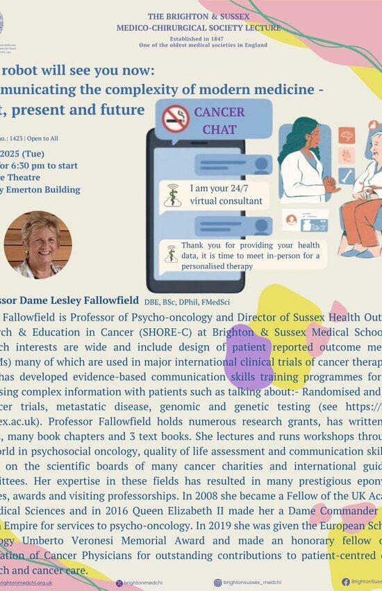 Our meeting programme is always diverse and typically includes topics such as the following: clinical medicine and surgery, public health, global health, medical humanities, history of medicine, medical ethics, personal experience and talks by experts in specific fields. Meetings normally take place face-to-face and are delivered live online. Please note that attendees under the age of eighteen must be accompanied by a responsible adult. For reasons of fire safety, all attendees are required to sign a register before entering the lecture hall. Staff/students at the Royal Sussex County Hospital and Brighton and Sussex Medical School do not need to book a seat in the lecture hall. These are offered on a first come first served basis.