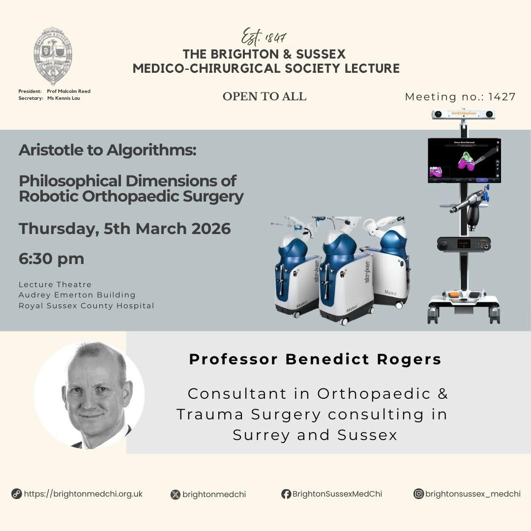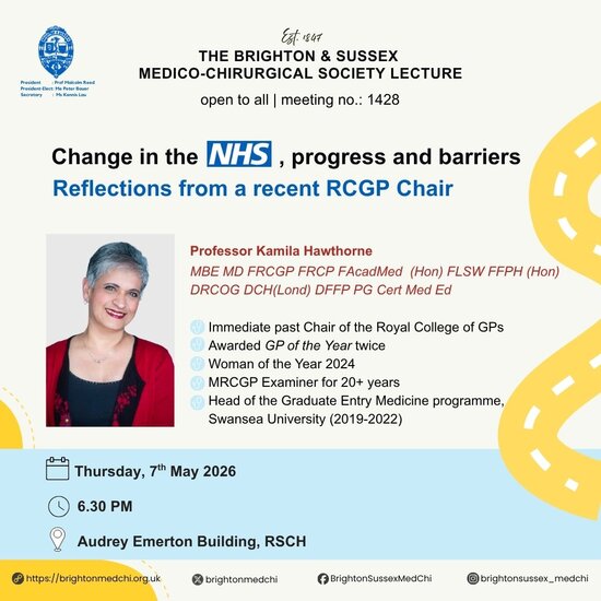 Our meeting programme is always diverse and typically includes topics such as the following: clinical medicine and surgery, public health, global health, medical humanities, history of medicine, medical ethics, personal experience and talks by experts in specific fields. Meetings normally take place face-to-face and are delivered live online. Please note that attendees under the age of eighteen must be accompanied by a responsible adult. For reasons of fire safety, all attendees are required to sign a register before entering the lecture hall. Staff/students at the Royal Sussex County Hospital and Brighton and Sussex Medical School do not need to book a seat in the lecture hall. These are offered on a first come first served basis.
