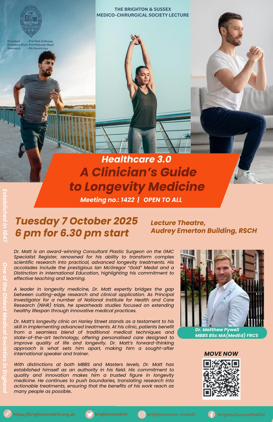 Tuesday 7 October 2025 | 6 pm for 6:30 pm start Lecture Theatre, Audrey Emerton Building, Royal Sussex County Hospital, Eastern Road, Brighton, BN2 5BE Join Dr. Matt Pywell for this inspiring session on the evolution of medicine. From reactive care to a preventative, personalised approach rooted in longevity science. Discover how to use cutting-edge clinical tools to optimise patient health, prevent chronic disease, and enhance vitality. Gain practical insights you can apply straight away, and explore how longevity medicine can reshape your practice and your patients’ lives. Dr. Matt is an award-winning Consultant Plastic Surgeon on the GMC Specialist Register, renowned for his ability to transform complex scientific research into practical, advanced longevity treatments.