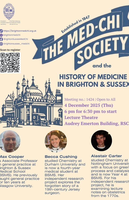 The Brighton and Sussex Medico-Chirurgical Society (“Med-Chi”, pronounced “med-ki” to rhyme with sky) was founded in 1847 as a forum for medical professionals to meet, learn and socialise. Today our function is similar but more inclusive. Membership is open to practising or retired medical practitioners, allied healthcare professionals, pharmacists or individuals whose interests align with the objects of the Society.