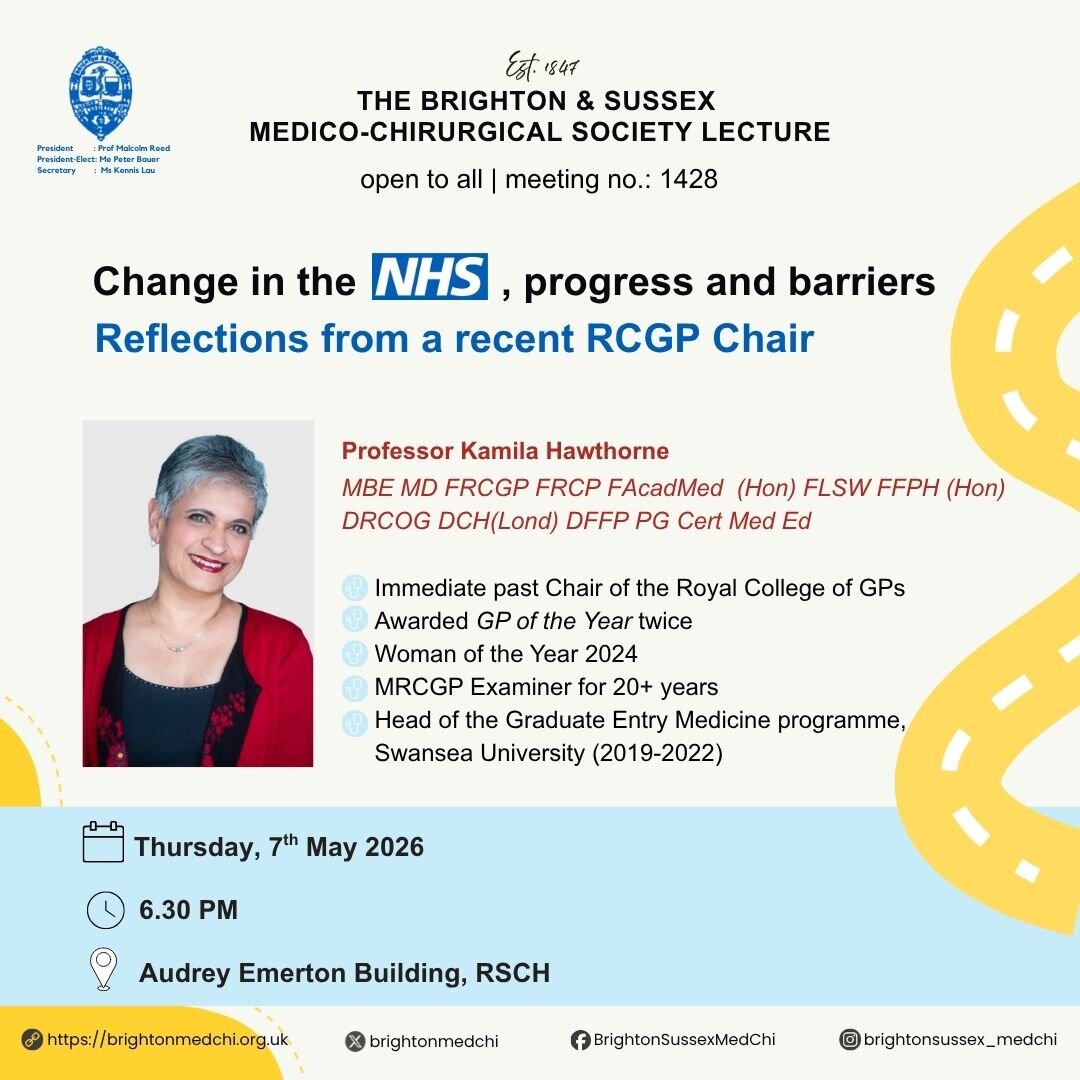 Our meeting programme is always diverse and typically includes topics such as the following: clinical medicine and surgery, public health, global health, medical humanities, history of medicine, medical ethics, personal experience and talks by experts in specific fields. Meetings normally take place face-to-face and are delivered live online. Please note that attendees under the age of eighteen must be accompanied by a responsible adult. For reasons of fire safety, all attendees are required to sign a register before entering the lecture hall. Staff/students at the Royal Sussex County Hospital and Brighton and Sussex Medical School do not need to book a seat in the lecture hall. These are offered on a first come first served basis.
